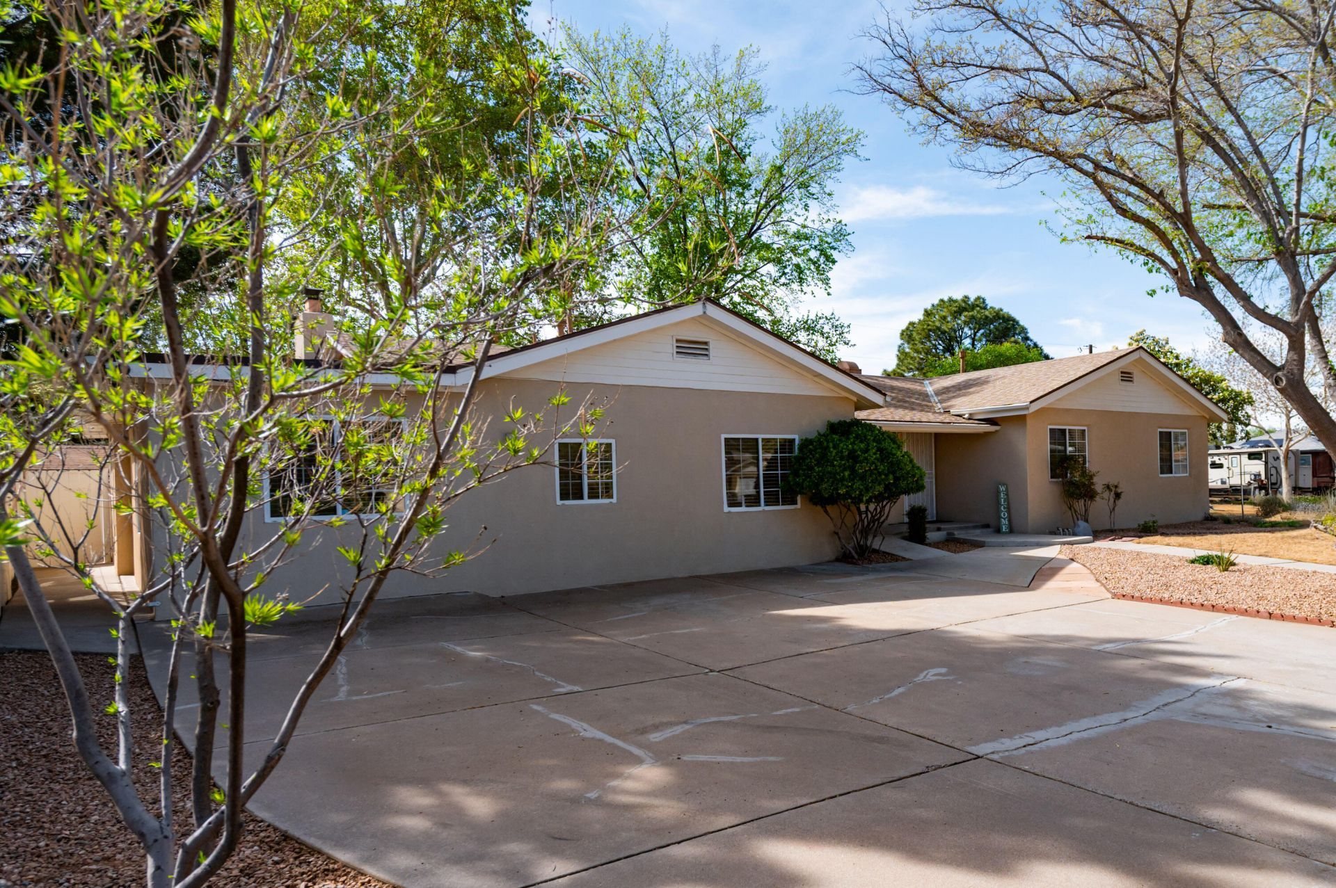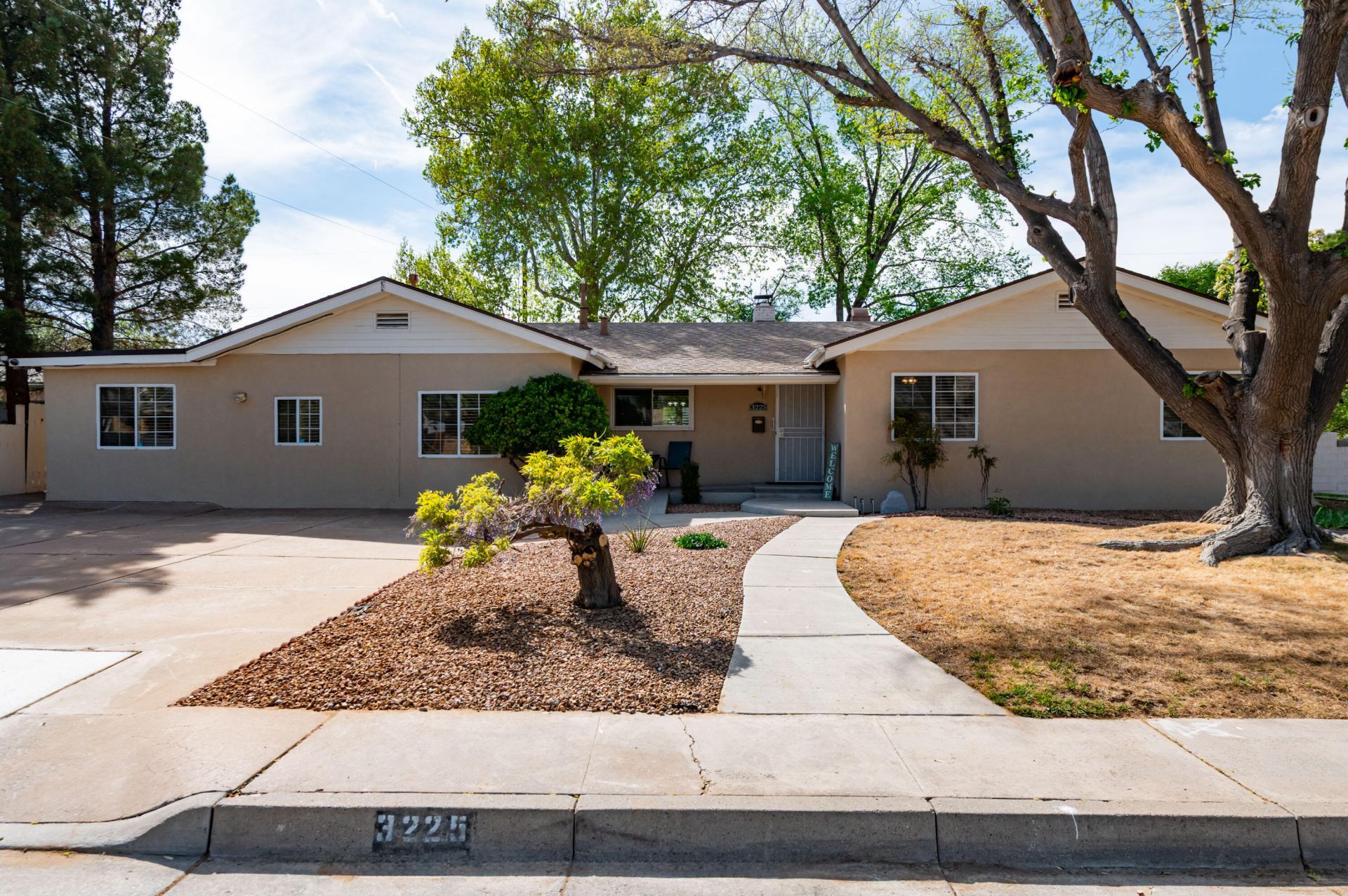 Home is nestled in NE heights setting with beautiful mature trees on a corner lot. Home is equipped with 7 bedrooms and 2 1/2 bathrooms plus to spacious living rooms and a functional office. Home is ADA compliant with wheelchair ramp access at the front porch, roll-in showers in both full bathrooms as well solid surface floor with no transitions through the home (wood-look tile on all flooring areas). Two family rooms both with wood burning fireplaces. Large kitchen with ample cabinet and counter space. Newer tankless water heater 2024. Beautiful backyard landscape and large covered patio for outdoor entertaining or peaceful relaxation.