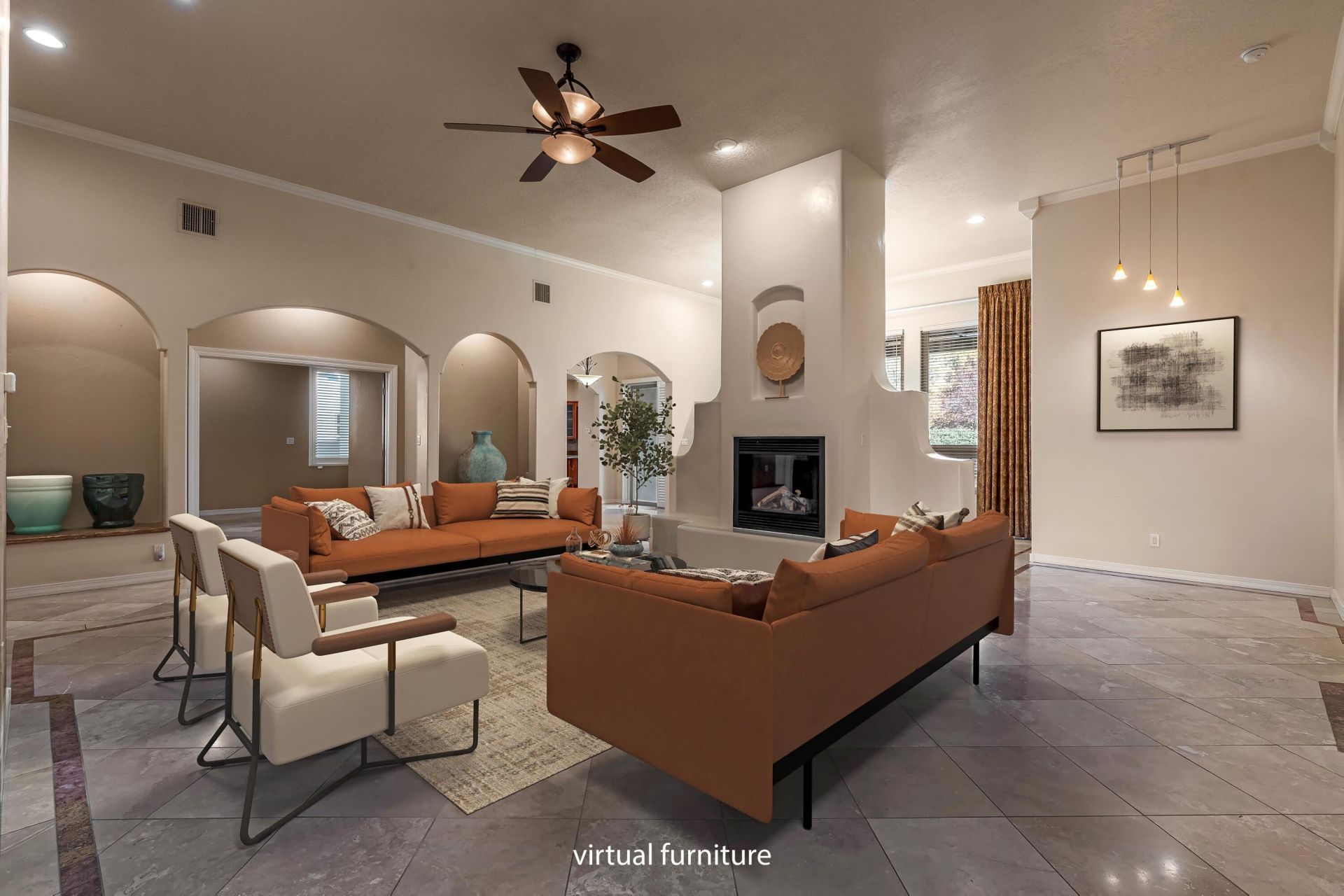 #3514 Sq. Ft. Step into this lovely, meticulously kept custom home just minutes from Albuquerque's Bio Park, Old Town, and the Sawmill District. You'll be conveniently close to the Bosque and nature trails, where you can enjoy walks, bicycle rides, and relaxing musings with nature. 3 bedrooms, dedicated home office or flex space, separate den, living room, dining room and large kitchen. Two and a half bath with a three car garage on a premium lot. The interior of the house lends itself to multiple decor and styles, with attractive travertine tile throughout its spacious living and graceful entertaining areas. Elevated finishes including the outdoor tiled covered patio dining area. A large kitchen, bright and cheerful, boasts abundant storage space and a large island suitable for creating