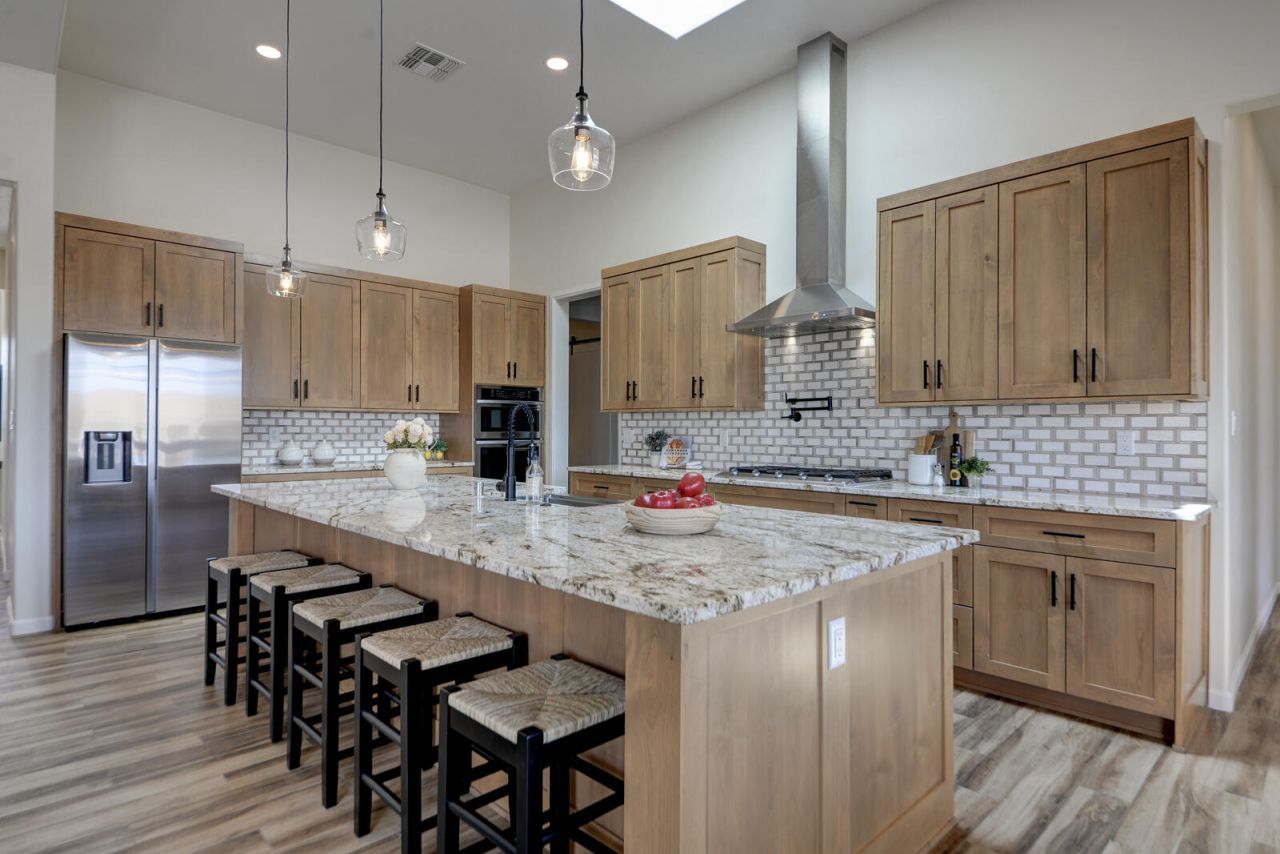 Custom-built 2 year old Modern Pueblo home on a spacious 1/2-acre lot with thoughtful upgrades throughout. This home offers an open layout with 12-ft ceilings in the main living areas and tile flooring throughout--no carpet. The kitchen includes a large granite island with a farmhouse sink, custom soft-close cabinets with built-in storage, Samsung stainless steel appliances (WiFi-enabled cooktop, microwave/oven combo, and refrigerator), a marble backsplash, and a skylight for natural light. The living room features an electric fireplace, built-in cabinetry, and sliding doors leading to the patio.The primary suite includes private patio access, dual walk-in closets with custom shelving, and a spacious bathroom with a walk-in tiled shower (dual valves), freestanding tub, and double vanities.